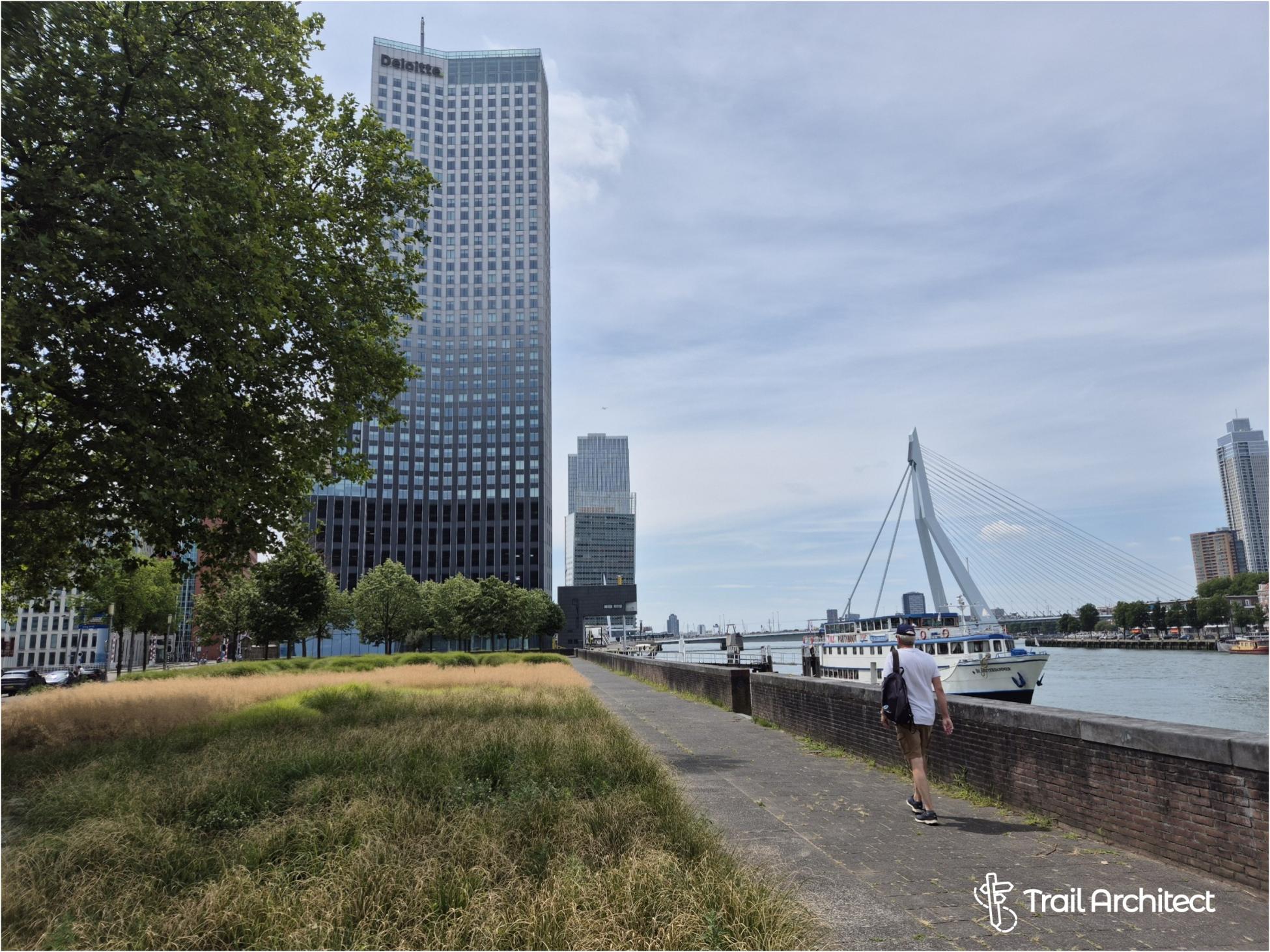 Let op: De watertaxi vaart als veerdienst (op afroep) op ma-vr tussen 7-10u en 13u45-18u30. (0,50 euro). Op andere tijden of in het weekend moet je vooraf via de app/website een rit boeken (5 euro, prijspeil 2025) www.watertaxirotterdam.nl.