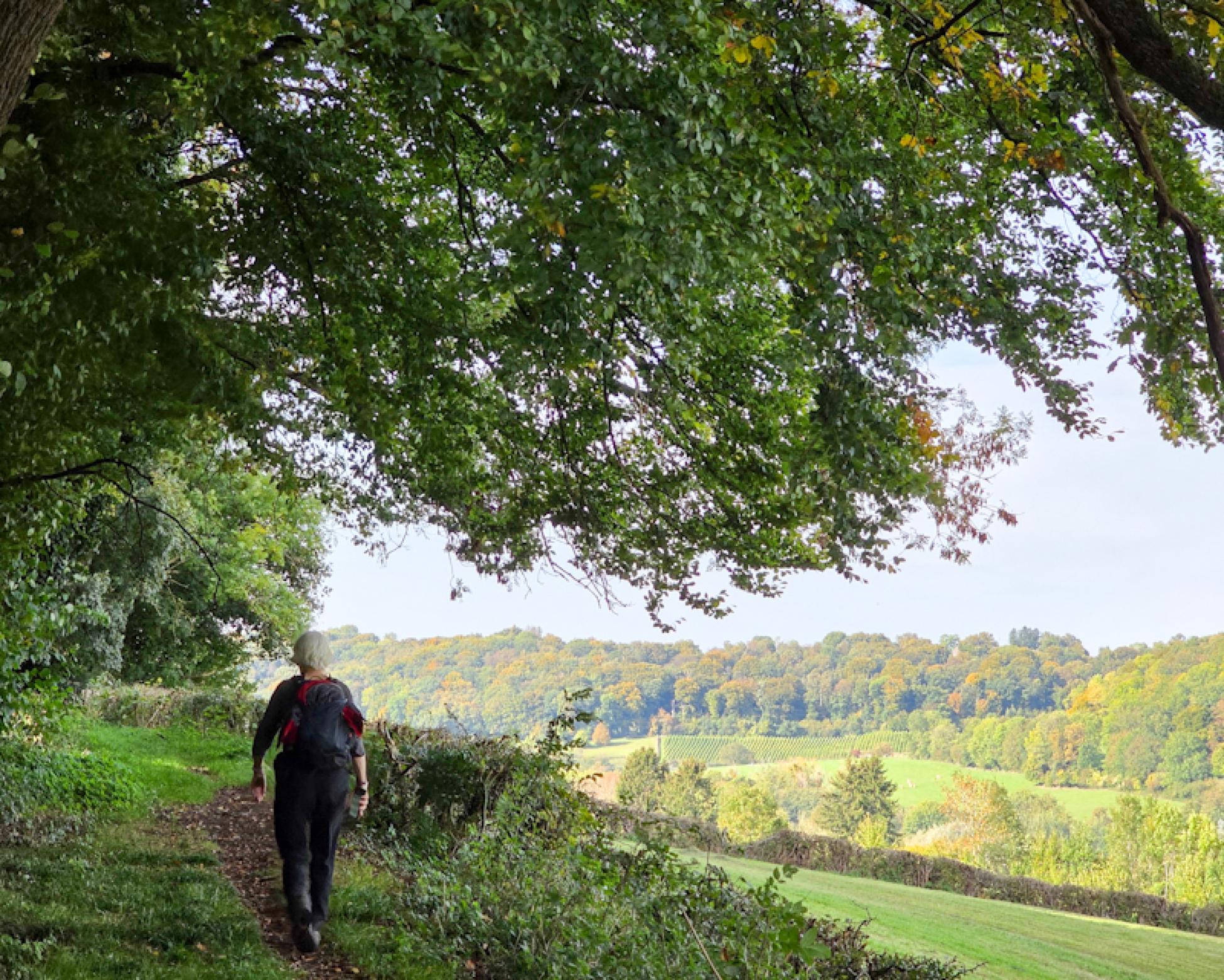 DetailsWe maken in de Voerstreek een pittoreske wandeling rondom de glooiende heuvels van het Veursdal met een kleinschalig coulisselandschap en langs de randen van - maar ook dwars door - de steile hellingbossen Broekbos, Roodbos en Vrouwenbos. De bossen waren voorheen échte productiebossen, maar worden nu met rust gelaten. Het zijn loofbossen, waar everzwijn, ree, wilde kat en das voorkomen, maar ook de beschermde hazelmuis. De route begint bij het Veltmanshuis, voormalig kapittelhuis uit de eerste helft van de 18de eeuw. Tot 1971 deed het dienst als pastorie. Pastoor Hendrik Veltmans was dé grote Vlaamse voorman die een belangrijke rol speelde in behoud van het Nederlandstalige karakter van de Voerstreek. De pastoor ligt begraven onder de vrijstaande Romaanse toren van de Sint-Martinuskerk, die stamt uit de 13e eeuw. We lopen via een holle weg langzaam omhoog naar de hoger gelegen graslanden met uitzicht op het hoge spoorwegviaduct in de verte. Later op deze wandeling zullen we nog twee keer over een spoortunnel heen lopen. Na het gehucht De Plank volgen we de rand van het Roodbos met prachtige panorama's tot we bij het gehucht Kies, halverwege de route op het hoogste punt zijn gekomen, rond 270 meter. Verrassend is de passage door een fruitboomgaard met appel- en perenbomen. We maken een doorsteek door het Vrouwenbos en dalen af naar het gehucht Veurs met wegkruis en vakwerkhuizen. Langzaam omhoog en op een pad omzoomd door heggen en hagen is het opnieuw genieten van de panorama's over graslanden met grazende koeien, houtkanten en graften. Bij het gehucht Krindaal ligt wijngaard Domein Pietershof op een zonnige zuidhelling op een gunstige plek voor de al 25 jaar oude druivenstokken. Aan het eind lopen we parallel aan het spoor met zicht op het beekdal langs de Veurs terug naar Sint-Martens-Voeren.